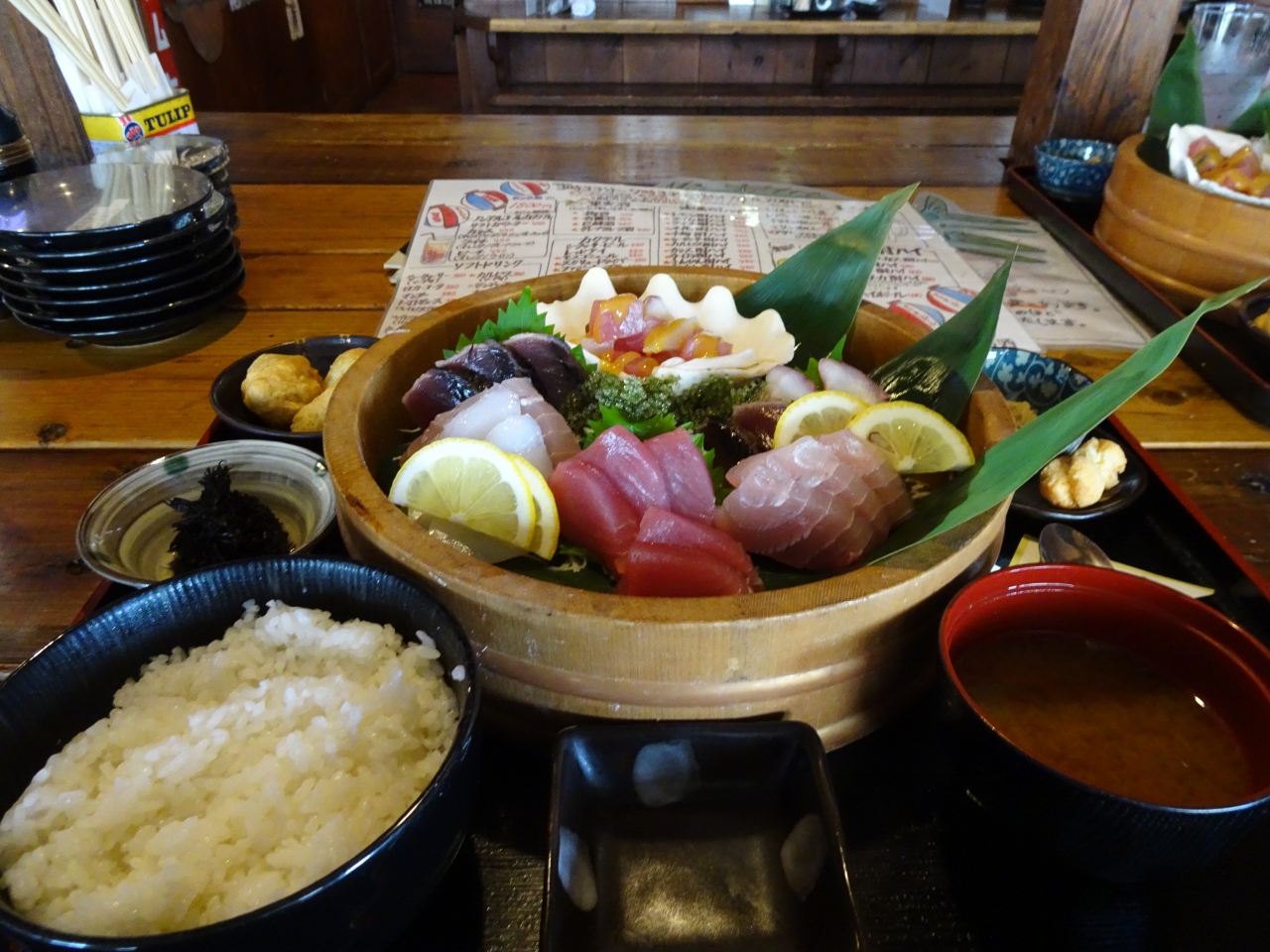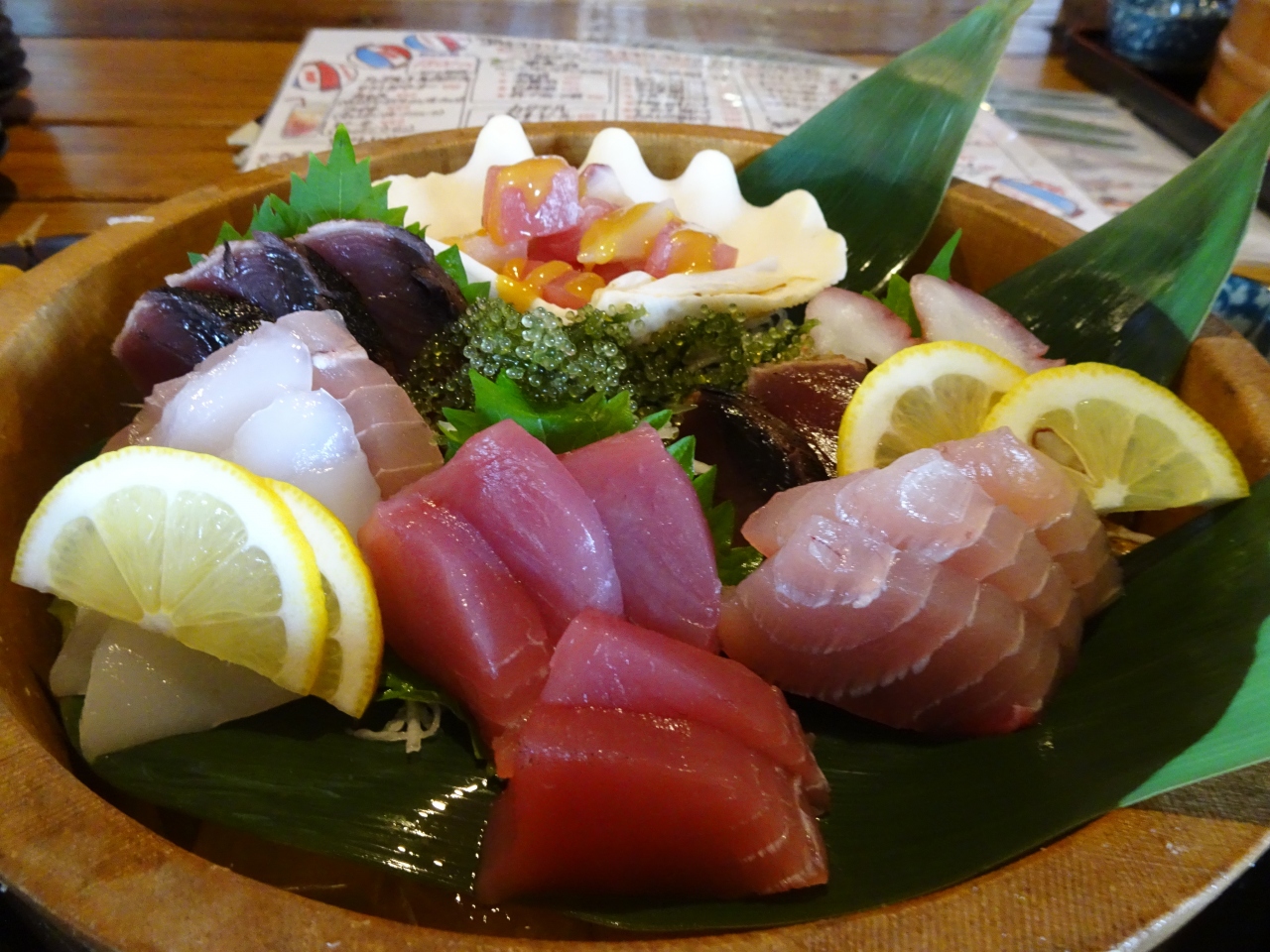 寿司桶いっぱいに、マグロ・白身・タコに海ぶどうまで数種類載せられた桶は圧巻です!