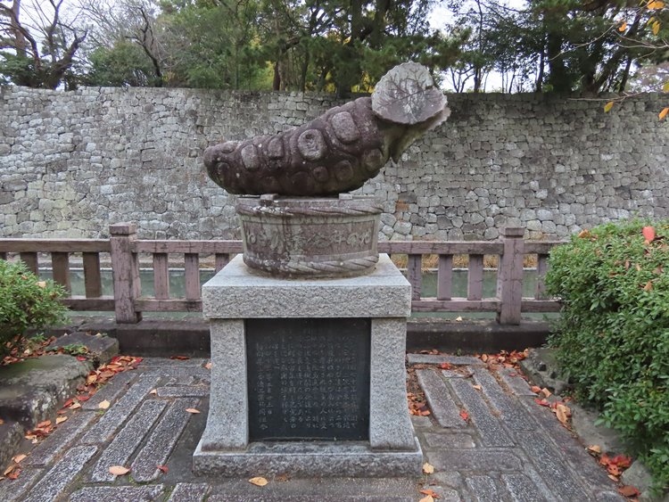 駿府城公園の南側、坤櫓から巽櫓へ歩く途中で見つけました。台座にわさびが乗っていて、なかなかにインパクトのあるモニュメントです。静岡はこの辺りでもわさび栽培?と思いましたが、わさび漬として商品化され、江戸末期にはすでに流通していた、ということのようです。
