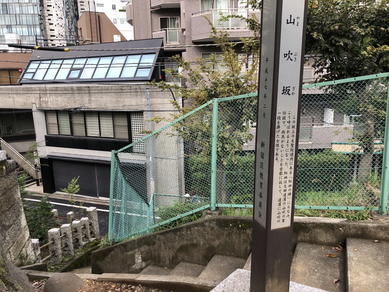 東新宿駅そばの新宿イーストサイドスクエアの東にあります。高台に建つ西向天神社と大聖院の間にある石段です。大聖院境内の紅皿の碑にちなんで名付けられたと説明柱に記されています。狭い石段です。大聖院駐車場内にある紅皿の碑に行くと、説明板に紅皿の墓と記されていました。太田道灌との話からとったきれいな名の石段です。
