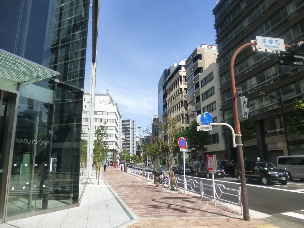 「平成通り」は、首都高速道路都心環状線と並行し、晴海通りから東京証券取引所までを結ぶ通りです。銀座界隈では裏通りの色彩が強いですが、北に行くにつれて道幅も広くなり、交通量の多い通りになります。茅場町近辺では通りの周辺にガラス張りの近代的なビルの姿もあり、銀座界隈とは様相も異なります。