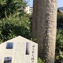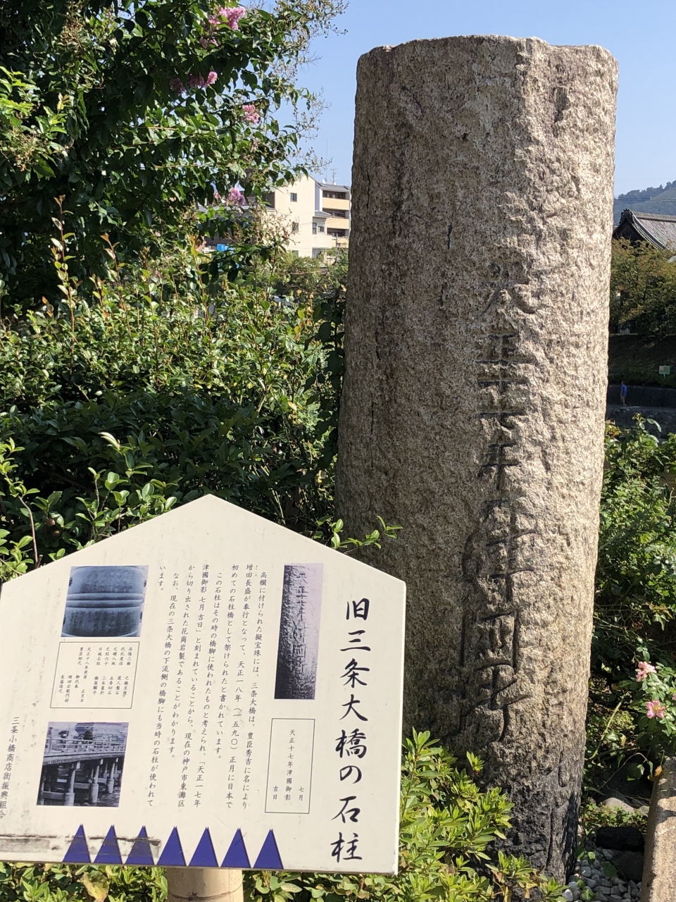 鴨川に架かる三条大橋の北西(スタバ前)に石柱と説明板が立っています。柱には「天正十七年津國御影」と彫られている文字が確認できます。豊臣秀吉の命により日本で初めて石柱橋として架けられたそうです。今もちゃんと残されていることに感動。普段何気なく渡っていた橋の歴史を知ることが出来ました。