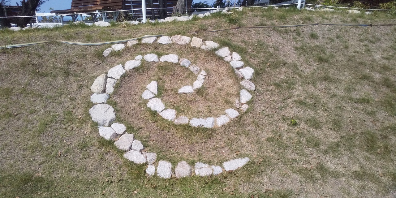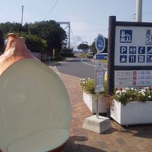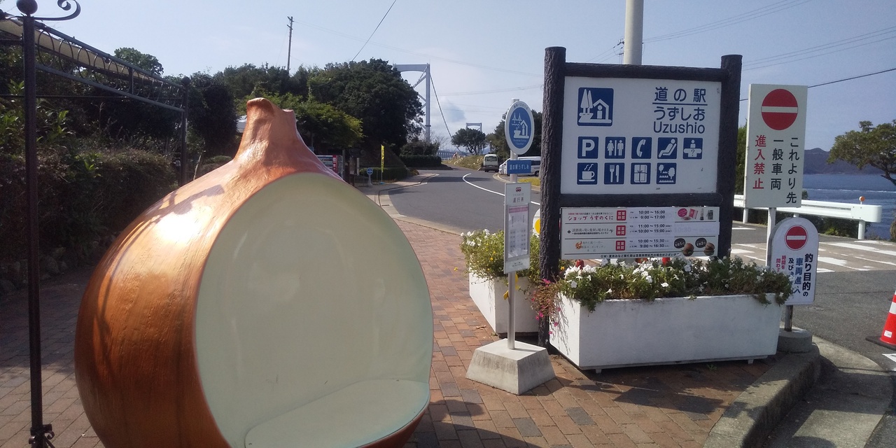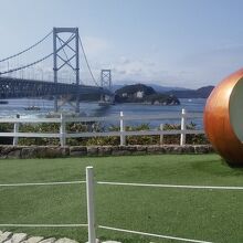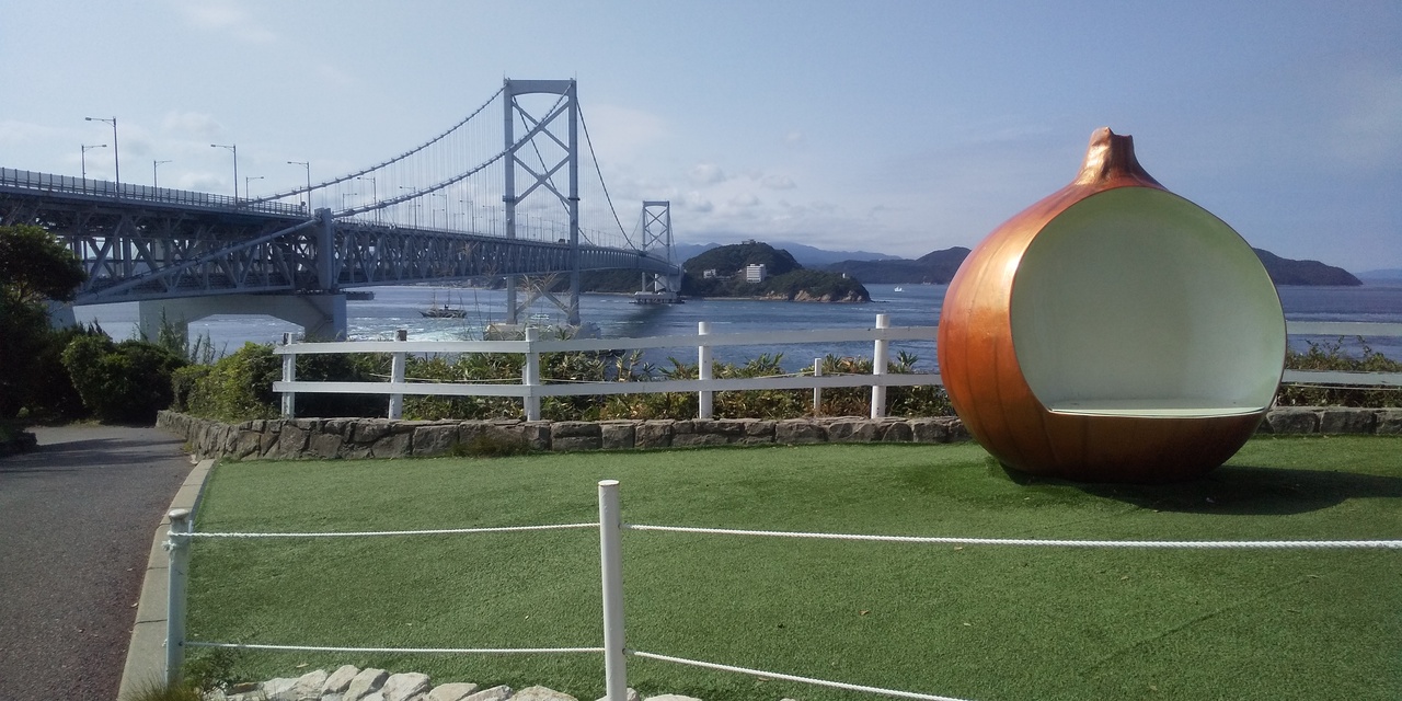 各所に記念撮影スポットもあります。名産品のタマネギの形をしたベンチと海峡大橋、渦潮をバックにシャッターを切りました。