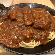 肝心のスパゲティは、泉屋発祥のスパカツをはじめカレースパカツ、ミートソース、ピカタ、ミラノ風、泉屋風、海の幸、ナポリタンの9種類。ピカタも美味とのことで迷いましたが、ここは「釧路と言えばスパカツ」ということで迷わずオーダー。待つこと数分、本店と同じく熱々の鉄板の上にスパゲティ、そしてカツの乗ったスパカツが登場。太めの麺、固さ、濃厚なミートソースの味付け、そしてカツ。言うことなし。大盛りにしましたが、ボリュームもあり、満足度高い。本店と異なり観光客はほとんど来ないので、比較的狙い目かも。