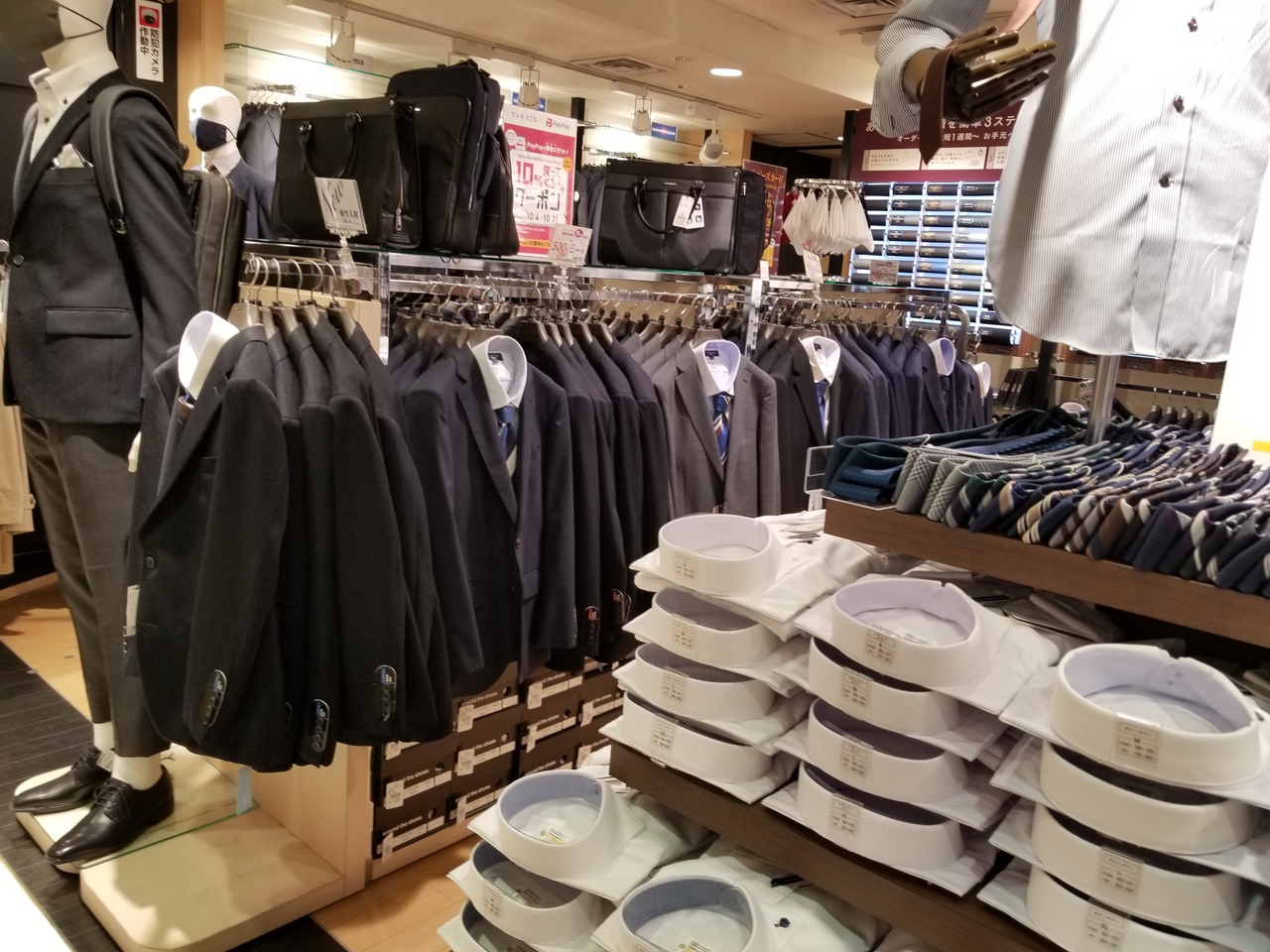 場所柄ビジネス向けの服がほとんどだ。店内は狭いので品揃えがいいとは言えない。