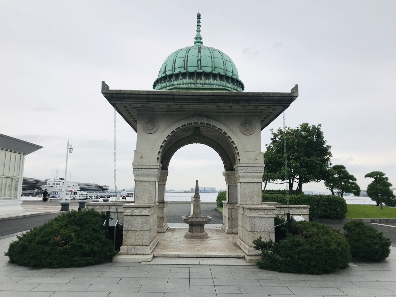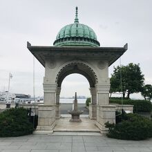 山下公園の西端にあり、神奈川県民ホールの向かい側にある出入り口から入るとすぐ目の前に設置されています。