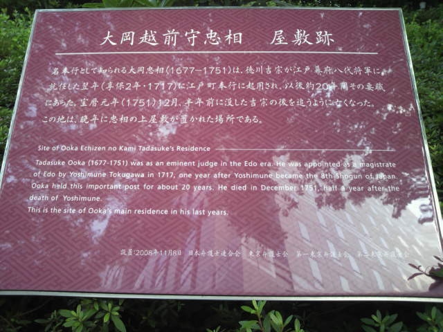 大岡越前忠相の江戸上屋敷が、霞が関の弁護士会館の敷地の中にあったとされ、同敷地内の西側の植え込みの中に、その標識が残されています。