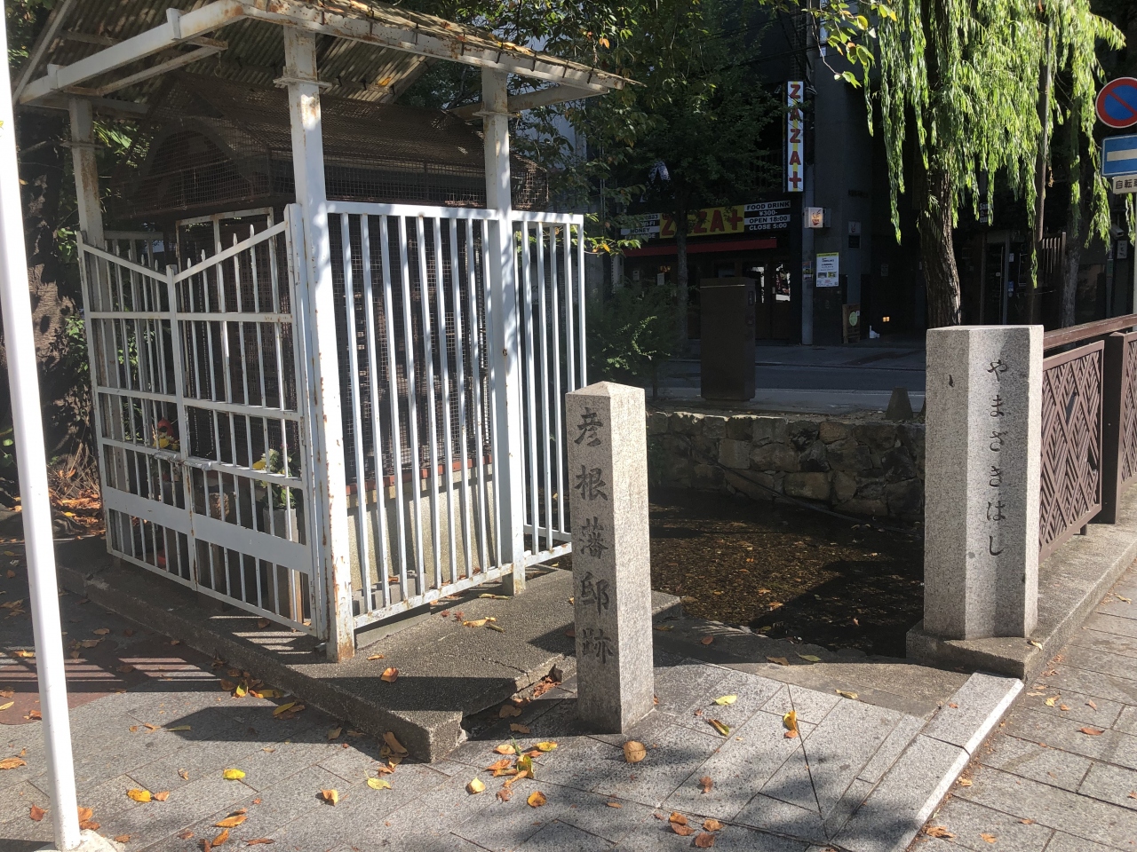 高瀬川に架かる「やまざき橋」の西北に「彦根藩邸跡」と書かれた石碑が立っています。説明板のようなものはありません。建物があったのは、ここから西側で河原町の方にかけて敷地があったそうです。藩邸が置かれたのは19世紀初めで比較的新しいみたいですね。