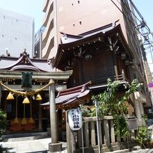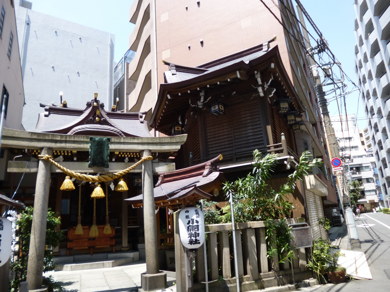 小網神社は、日本橋小網町の裏通りに建つ歴史ある神社です。現在の社殿と神楽殿は関東大震災後に再建されたものということです。濃い茶色をした落ち着いた色彩の建物で、土地の区画にあわせて造られた五角形の平面を持つ神楽殿の姿が印象的でした。