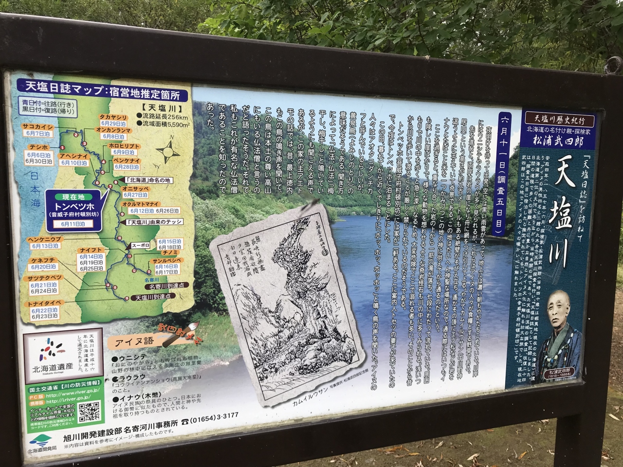 碑の目の前には天塩川。そして、その前には宗谷本線が走っています。碑は、電車から見えるようにするためか、川に向けて設置されています。
