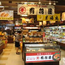 鹿児島空港の2階、出発ロビー中央にあるお土産やさんです。月揚庵など各社のさつま揚げや焼酎、鹿児島茶、黒糖製品、スイートポテトからキーホルダーやマスコットのようなものもあって品ぞろえは良いです。鹿児島からの帰り、最後にお土産を買うのに便利です。