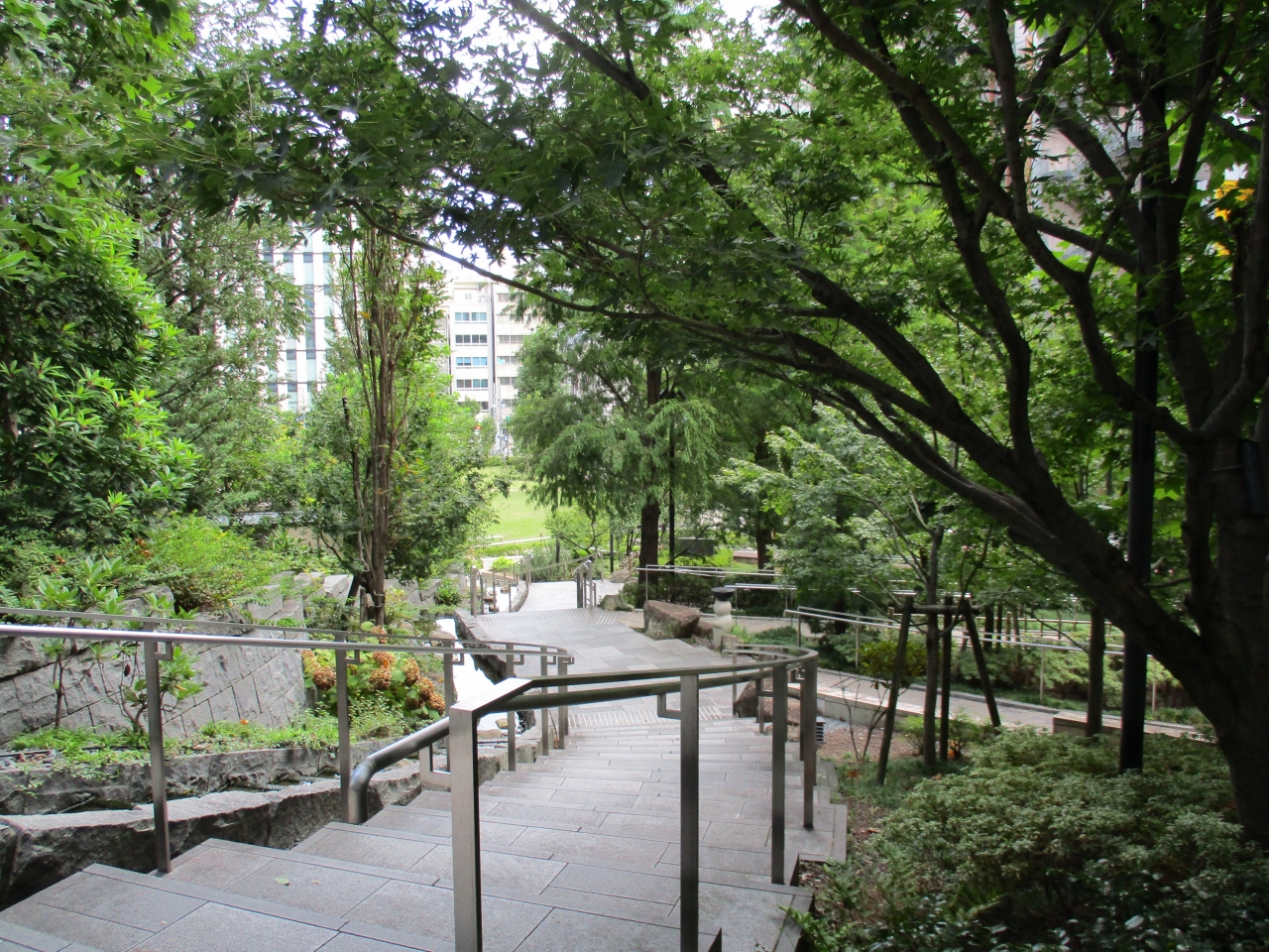 神田淡路町周辺を散歩しいた時に立ち寄った公園です。公園内はちょうど坂に造られた階段沿いに、小さな小川のような水路があって、とてもよい雰囲気でした。都会の中とは思えないほど木々も多くて緑が豊かなので、ゆっくりできる公園でした。