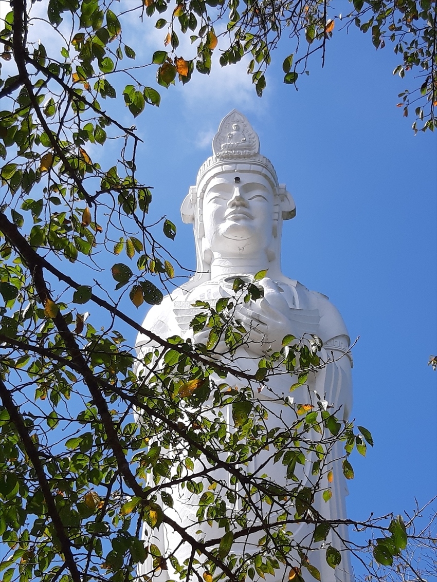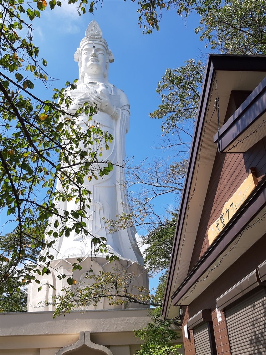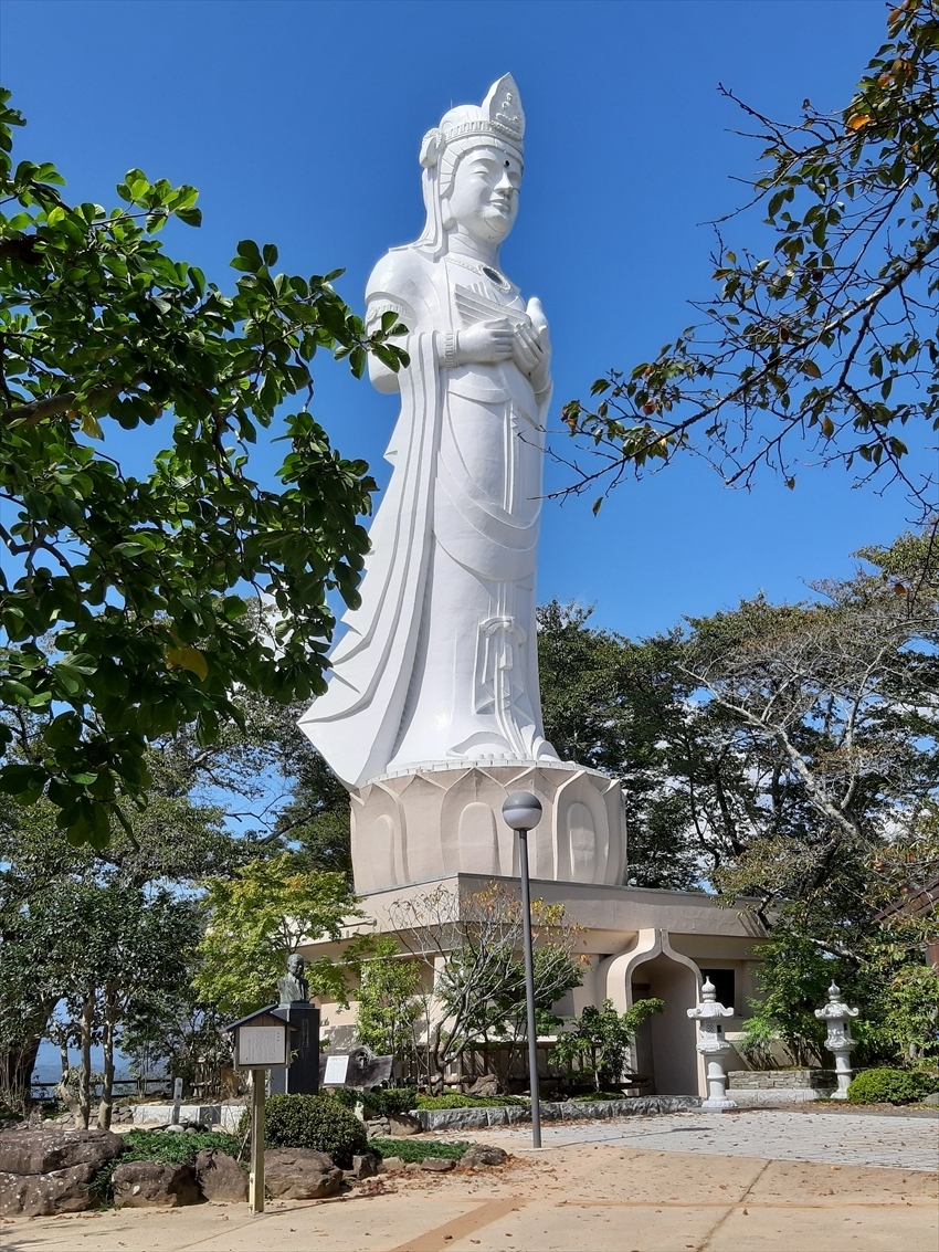 ハトを胸に抱いて微笑みを浮かべつつ遥か東の方向を見ている観音像は、見る人を穏やかな気持ちにさせてくれます。