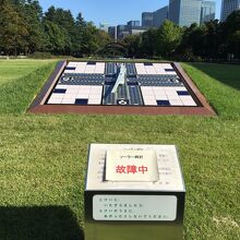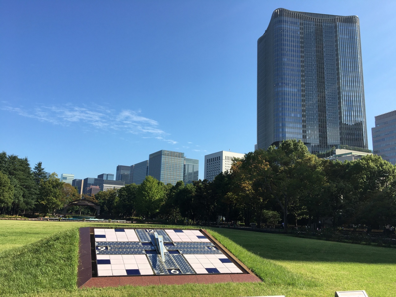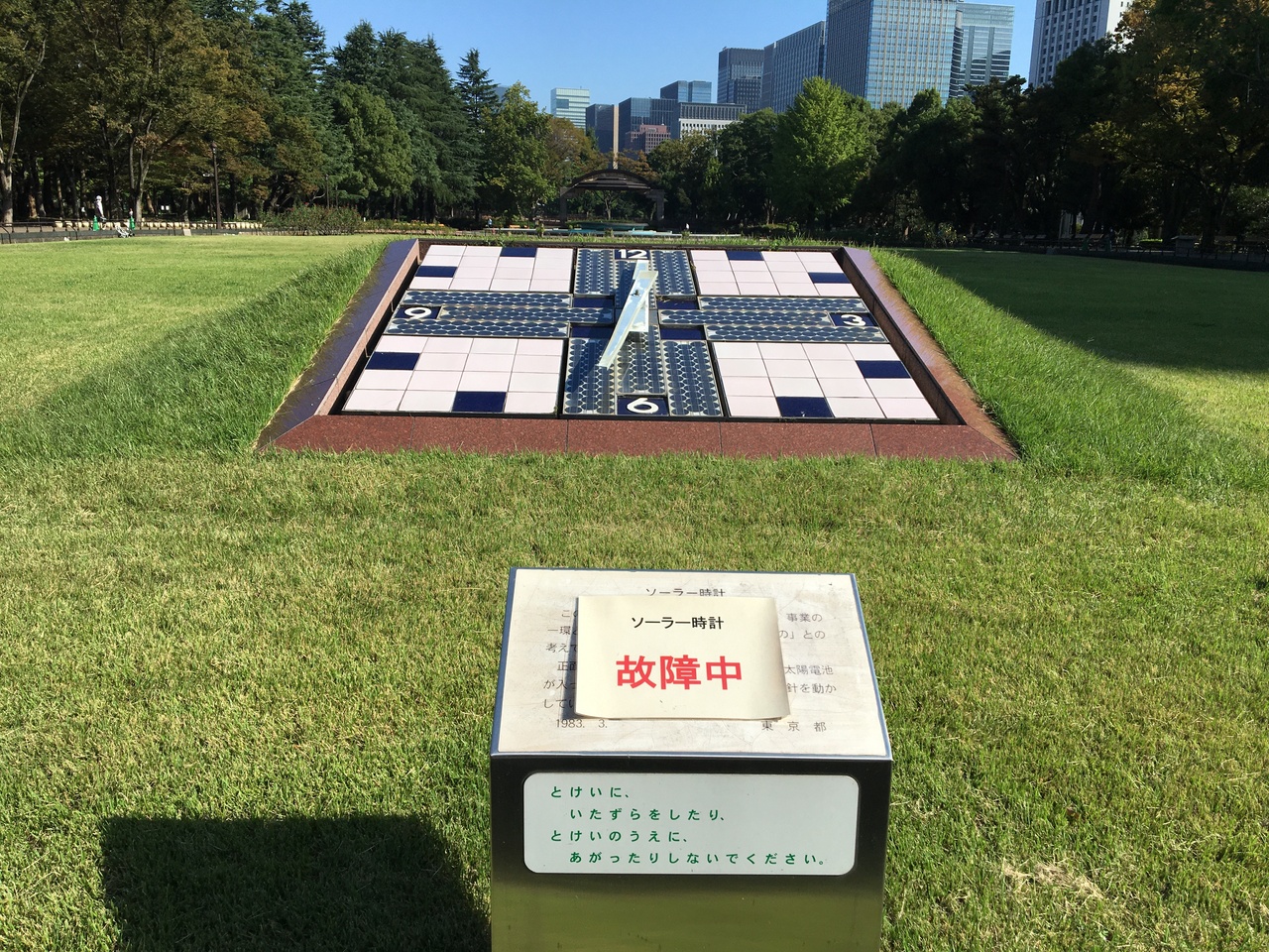 日比谷公園の第二花壇の中にある巨大なソーラー時計です。日比谷公会堂と向かい合うような位置にあります。残念ながら、訪れた時は故障中の張り紙がしてあり、動いていませんでしたが、ソーラー時計のある場所からは、第二花壇越しに日比谷ミッドタウンのビルを臨むことができ、公園と高層ビルのコントラストが印象的な写真を撮ることができました。