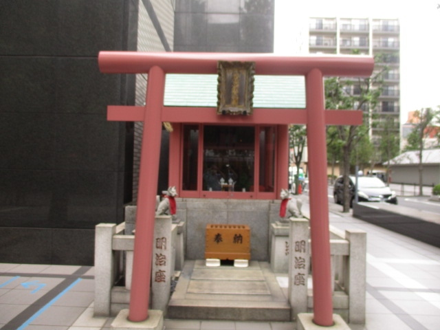 都営地下鉄新宿線浜町駅からすぐの明治座ビルの脇の浜町公園寄りに明治座稲荷神社が鎮座してます。明治座稲荷神社は笠間稲荷神社の東京分社で商売繁盛にご利益があります。鳥居と祠は赤色が主体でガラスがはめ込まれてました。お狐様は宝珠、巻物を咥え可愛いです。こじんまりした稲荷神社ですが演目成功を祈ってファンの方々が手を合わせてました。