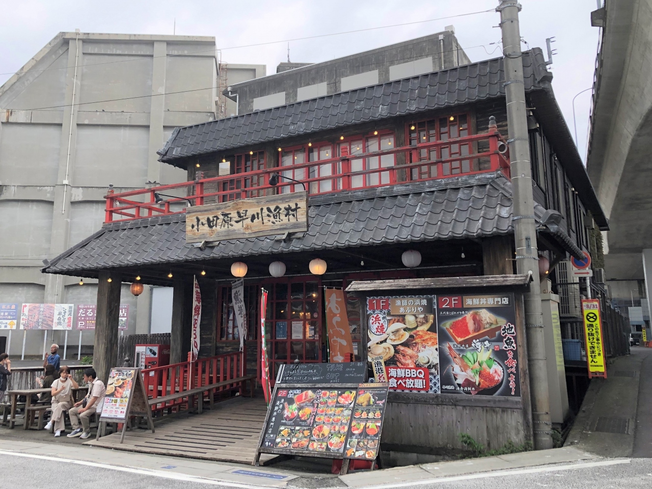 東海道線の早川駅から歩いて5分、小田原漁港の堤防近くにある飲食店です。瓦屋根の2階建ての建物に真っ赤な欄干が作りつけられていて、昭和レトロな雰囲気になっています。1階にはお土産屋さんと浜焼きのお店など、2階には海鮮丼のお店が入っています。