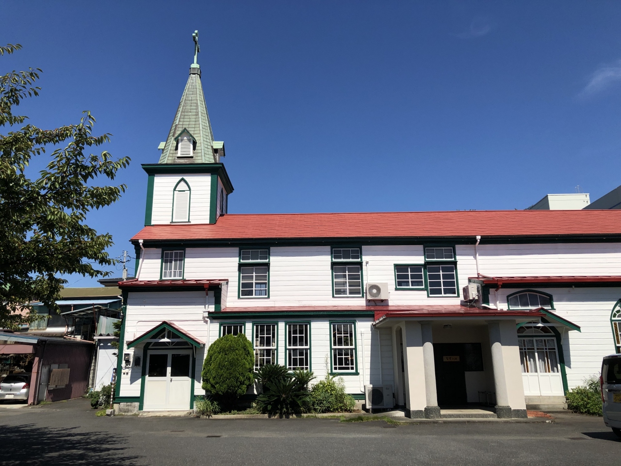 JR小田原駅から歩いて8分ほど、住宅街の中に広い敷地があり、その中に2階建ての教会の建物があります。青銅色のとんがり屋根の塔がが目をひきます。教会の白い壁に赤い屋根の建物の中に、ミサを行う広い部屋があります。