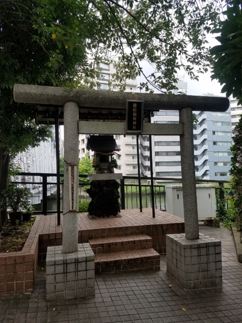 南高橋を新川側に渡った袂にあります。鳥居をくぐるとあるのは小さな祠ですが上に屋根が設置されていて特別感があります。名前から何となく想像していましたが徳川家に由来があり元々の御神体は徳川家の遊船のへさきを切って掘ったものだったそうです。町中で気軽に徳川家由来のものに触れられるとお得感がありますね。