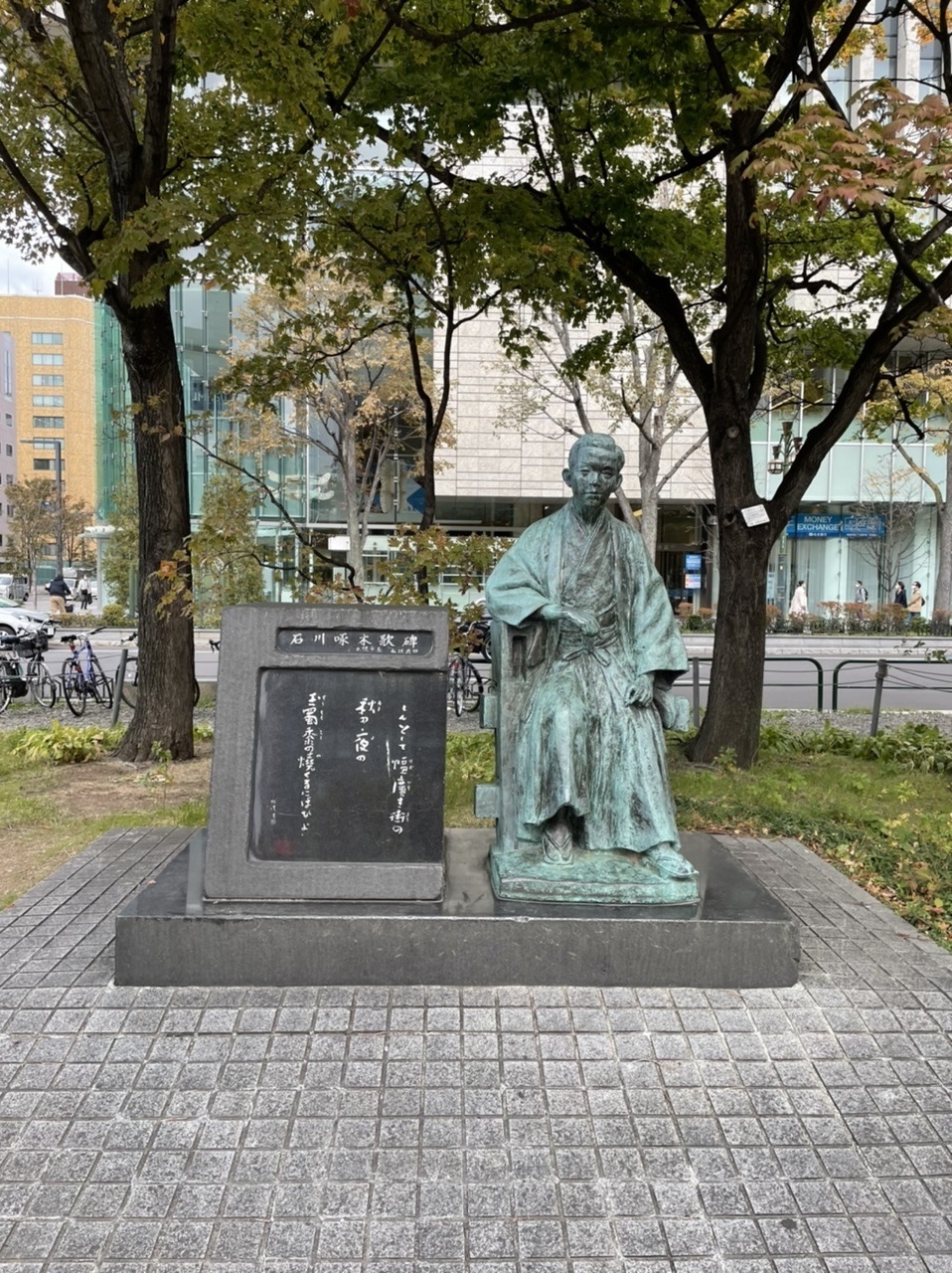 大通公園の西3丁目エリアに、石川啄木の銅像と歌碑が建てられています。石川啄木が明治後期、札幌に滞在したときに詠んだ歌が歌碑に刻まれています。現在大通公園の名物となっている焼きとうきびが、歌の題材に使われています。その当時から焼きとうきびを販売する屋台があったことに驚きました。