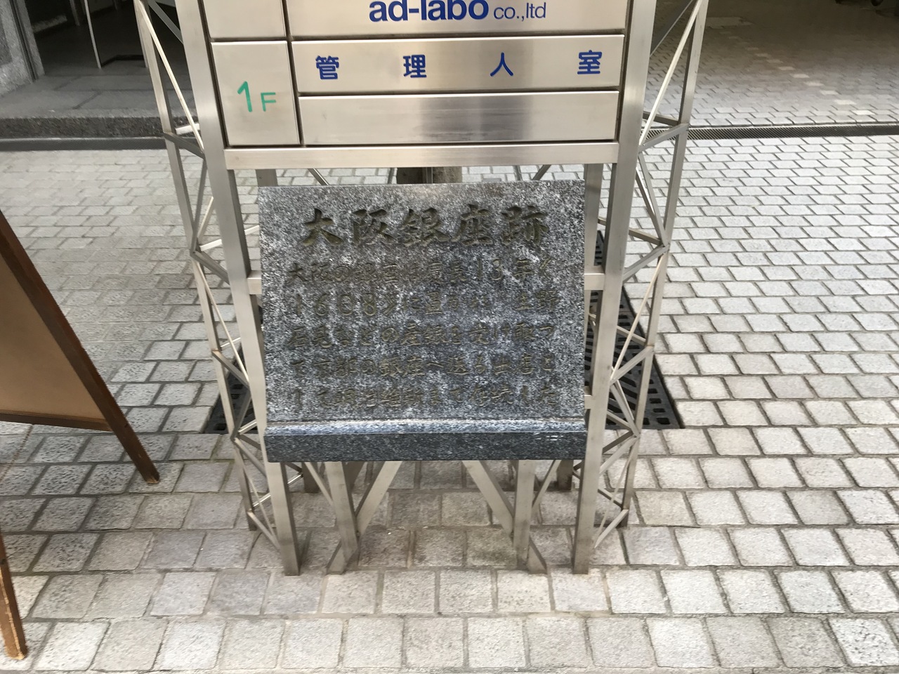 大阪銀座跡は、地下鉄北浜から徒歩5分、高麗橋から東へ少し行ったところ三精ビルの前に小さな石碑がありました。銀座は東京が有名ですが、大阪にもあったようです。1608年にこの地に銀座が置かれたが、通貨は製造せず。主に生野、石見銀山の産銀や粗銅から抽出した銀を京都へ回送する役割を担っていたとのことです。