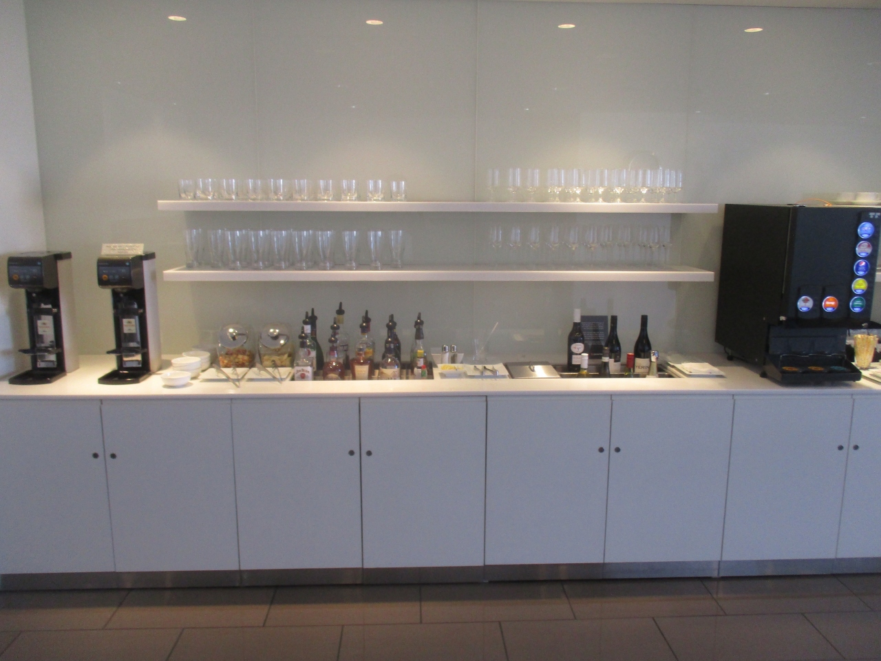 カンタスビジネスラウンジの一般ラウンジですが、アルコールの種類が充実していました。定番のビールからワイン、シャンパンまで利用できました。特に、利用したこの日は珍しい地酒や焼酎が数多く置いてありました。丁寧な解説が付いており、ついつい試飲したくなります。