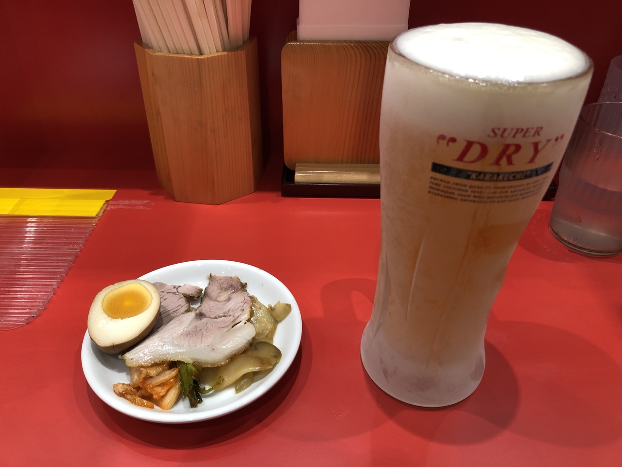 今回はまず、ビールが飲みたい気分だったので、生ビールと簡単なおつまみのついた500円の「ほろ酔いセット」からスタート。ラーメンのトッピングが肴になったセットですが、生ビール単体が390円なのでコスパはかなり良いと思います。そしてメインのラーメン。中華そばにするかつけそばで迷いましたが、王道の中華そばポークに。せっかくなので肉増し、大盛りにしまし。