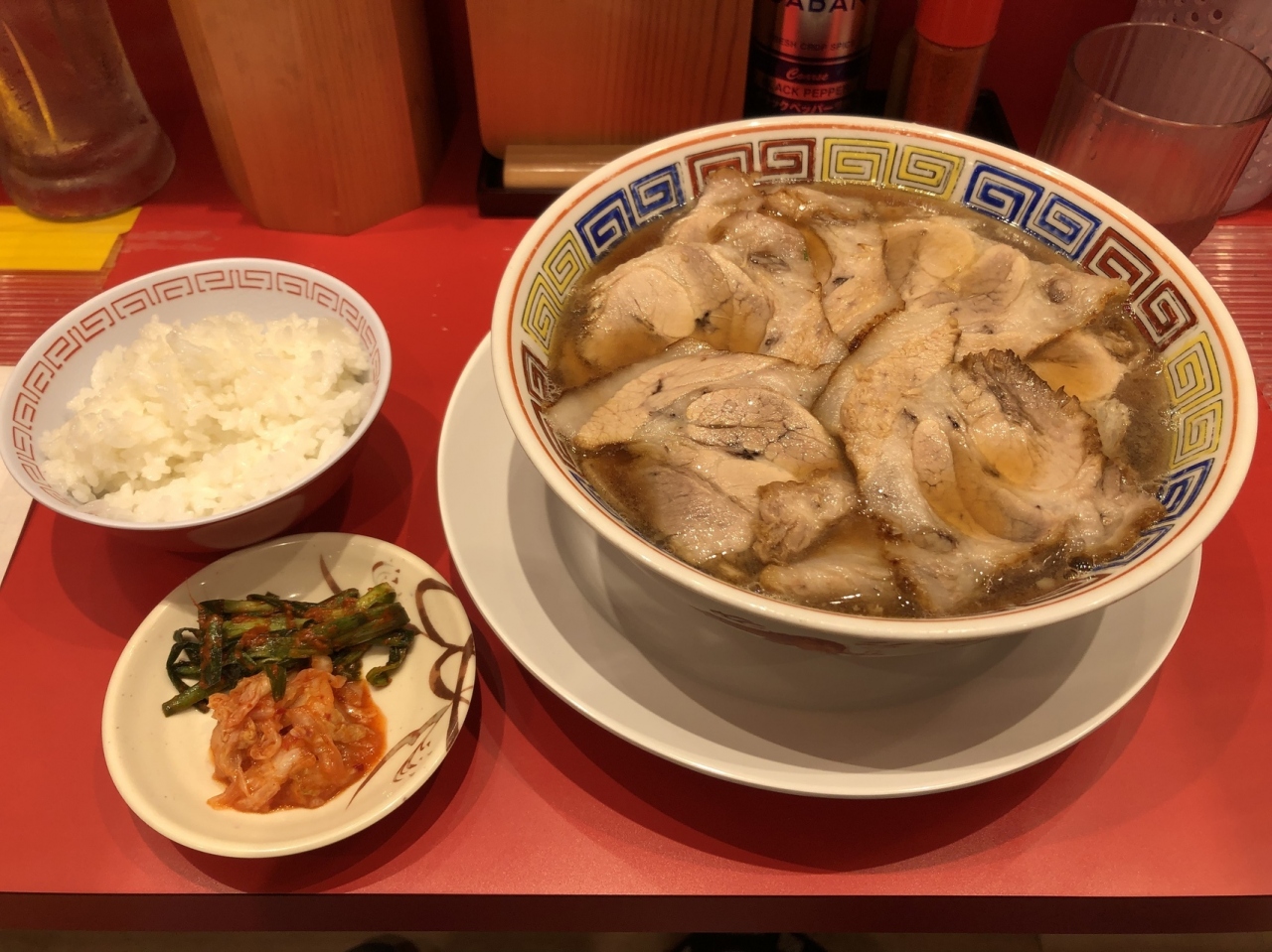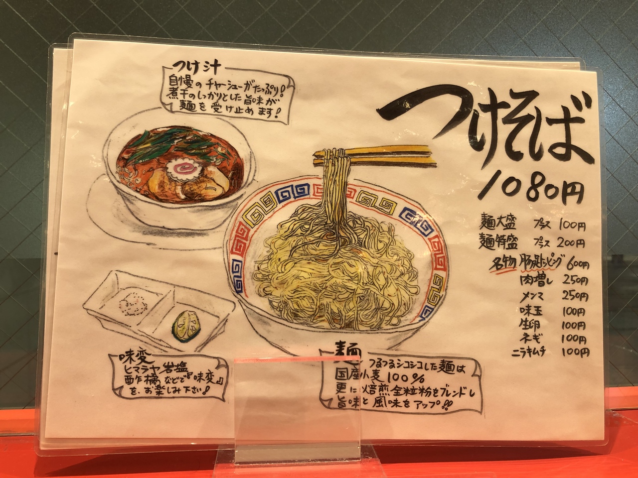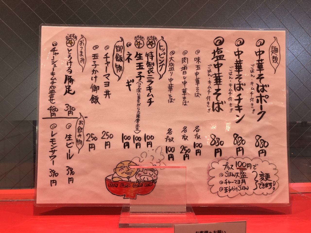 こちらのお店のメニューは、鶏ガラスープベースのチキンか豚肉と豚足ベースのポークの中華そば2種類と、塩中華そば、つけそば、塩ワンタンめんとなっています。無料で中華そばはキムチとご飯がつくのが嬉しい。ご飯はプラス100円で大盛りがチャーマヨ丼、卵かけご飯にできます。