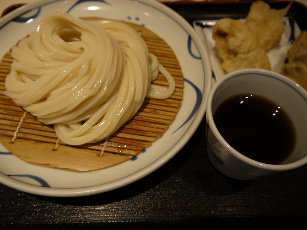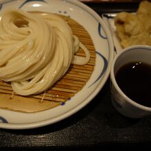 ざるうどん(小)500円に天ぷら(まいたけ、とり天)を注文。