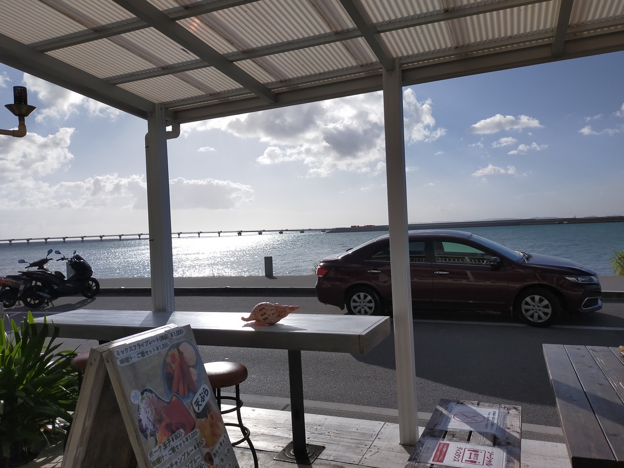 空港すぐ近くで行けるウミカジテラスにある店。とにかく暑いのですぐ目に入ったので、シェイクを頼んだら、生から作ってたのかな?時間かかりました。でもとても美味しかったし、テラス席は、海が見えるのでサンセットは素敵でしょうね。