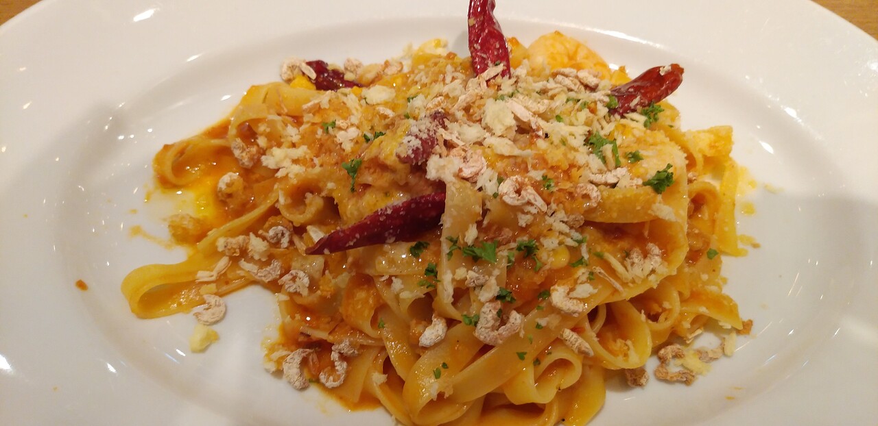 海老ボロネーゼは適度にぴりとしていて面もタリアテッレでおいしかったです。