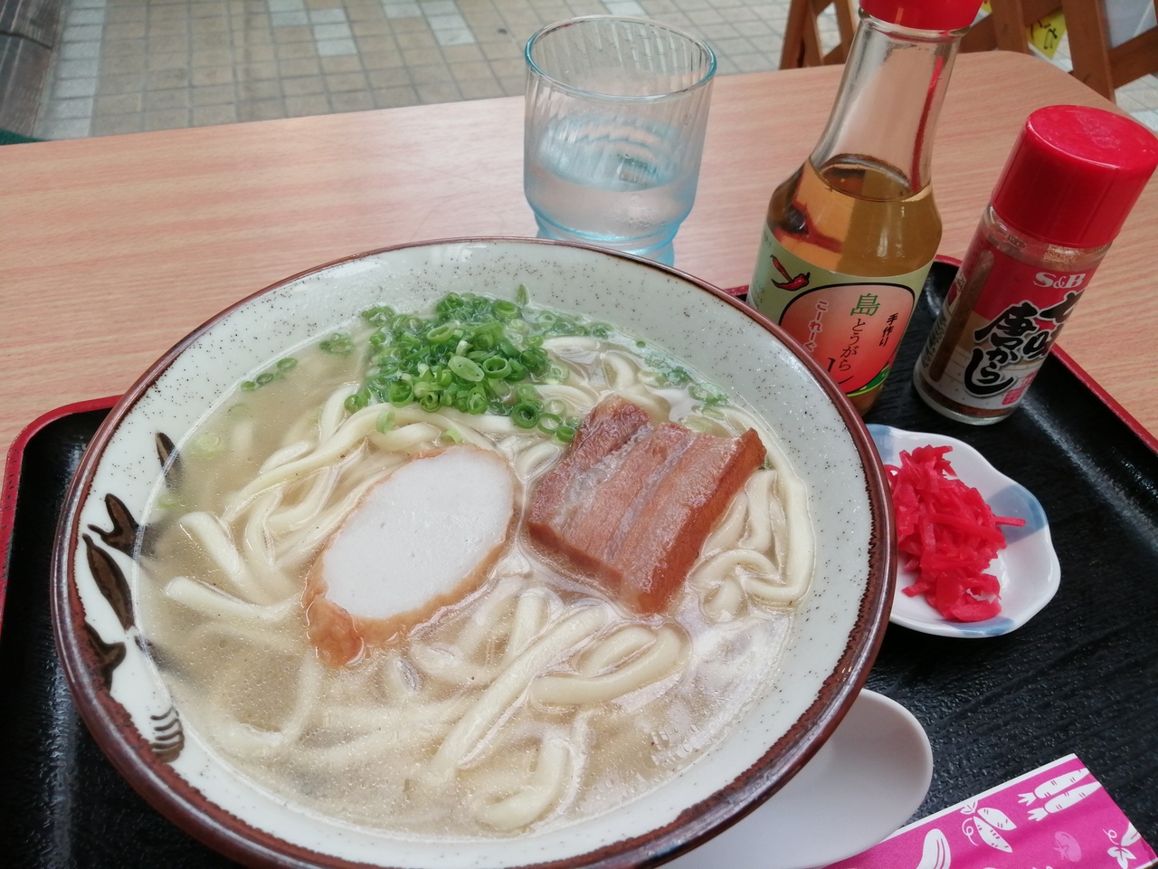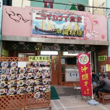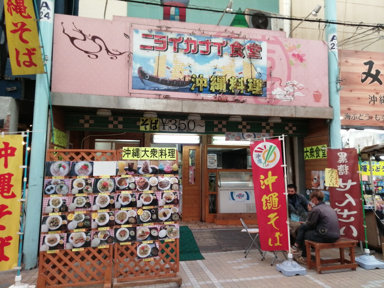 平和通り商店街、花笠食堂に入る路地の入口付近にある食堂です。「そば ¥350~」という文字に目が留まり、店先に張り出されている写真付きのメニューを見てみると確かに「沖縄そば(小)¥350」とありました。