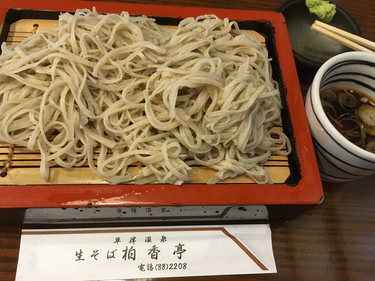 西の河原露天風呂の後で昼食時間になり、選んだお店が柏香亭さんです。お蕎麦屋さんが何軒もあり迷ったのですが、湯けむりガイドさんがオススメしていたこちらのお店に決めました。こちらのお店だけ数人並んでいたので、たぶん人気店なのだと思います。暑い日だったので「盛りそば」を美味しく頂きました。支払いは現金のみです。