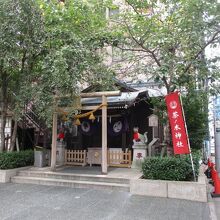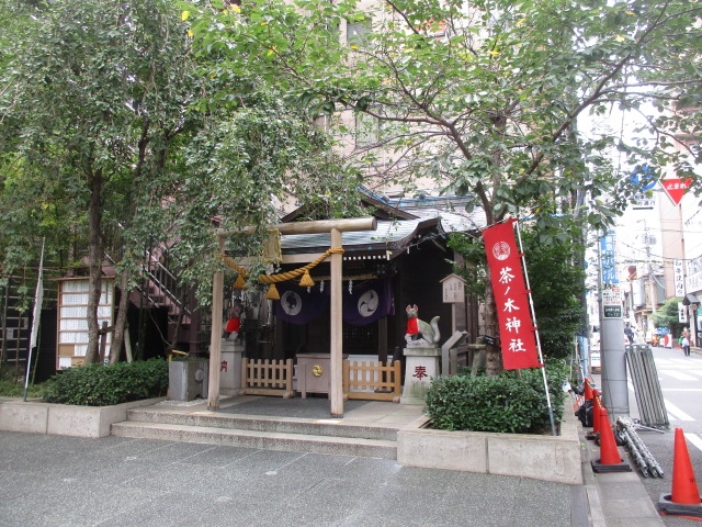 東京メトロ半蔵門線水天宮前駅6出口より水天宮前交差点を渡り新大橋通りを日本橋方面に進み右折すると茶ノ木神社に着きます。茶ノ木神社は下総佐倉城主大老堀田家中屋敷の守護神として祀られていて周辺にお茶の木が植え込まれていた事からこの名前がついたようです。現在はオフィスビル街の大きなビルの脇に鎮座している小さな稲荷神社ですが良く手入れされお狐さまがキリッと勇ましく見えます。日本橋七福神布袋尊の幟が鮮やかでした。