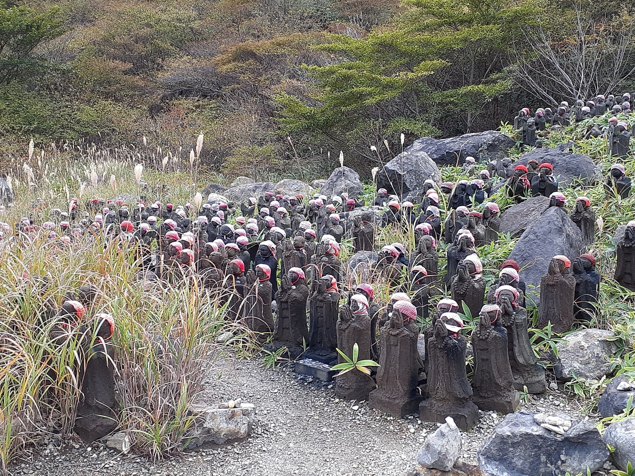 名前も知らなかったのですが、那須岳の帰りに通りかかったので寄りました。不思議な雰囲気で硫黄臭が漂います。お地蔵様がたくさんあり、遊歩道ができています。この時期ススキがあやしい雰囲気をだしています。混んでいなかったのに駐車場が狭いため、順番待ちでした。