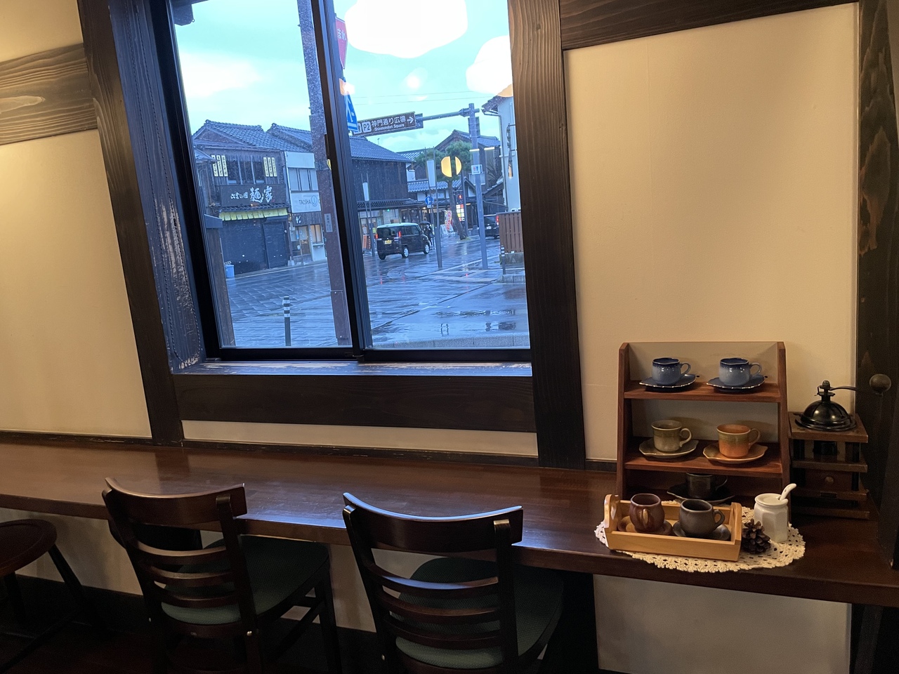 出雲大社の神門通りにあるカフェです。すぐ横に大きな駐車場があります。内装の落ち着いたすてきなカフェです。テーブルとテーブルの間が広く、この時期、安心です。出雲大社参拝後に、入店。ぜんざいをいただきましたが、雨に濡れた体がとても暖まりリラックスできました。