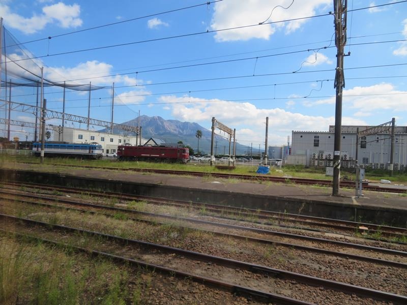 この日は上りの特急36ぷらす3に乗りましたが、鹿児島駅に着くと構内の機関車越しにもう桜島が見えていました。