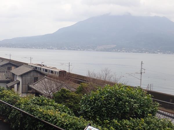 上り列車で鹿児島駅を出て東へ向かうと車窓右手の錦江湾越しに美しい桜島を眺めることができました。