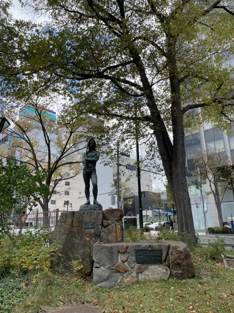 大通公園の西3丁目エリアにあります。北洋銀行が本店新築記念と大通公園緑化、地下鉄東西線の開通に合わせて寄贈した銅像です。湖のような清らかな息吹きを若者に感じてほしいという想いが込められているそうです。