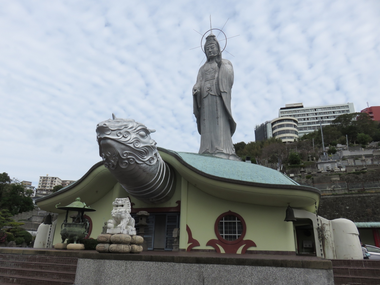 黄檗宗の寺院で、山号は分紫山1628年に建立され、崇福寺、興福寺とともに「長崎三福寺」と呼ばれているようです。福済寺の観音様は、高さ18メートル、重さ35トンで特徴的なのは巨大なカメに乗っているのに驚きました。原爆の犠牲者を弔うため、世界平和を祈るために1979年に建立されたようです。