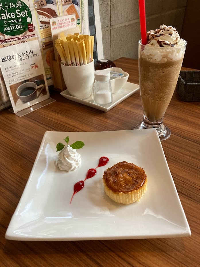 今回はティータイムにヘーゼルナッツコーヒーフラッペとバスクチーズケーキを注文しました。