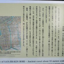 御門通りの首都高速側、新橋出入口の近くに説明板、礎石があります。三十間堀跡は江戸時代初期にできた海運用の堀で、その長さが三十間(約54m)あったことからこの名前がついたそうです。今は埋め立てられて面影はありません。