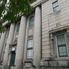 建物の正面にあるギリシャ建築のような円柱の柱が印象的な建物です。