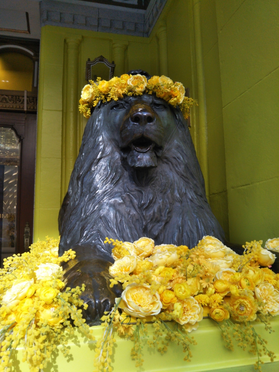 日本橋界隈のイベント「FLOWER」に合わせ、ライオン像も華やかなFLOWERの装いに。こころなしか、嬉しそうに見えてきます。