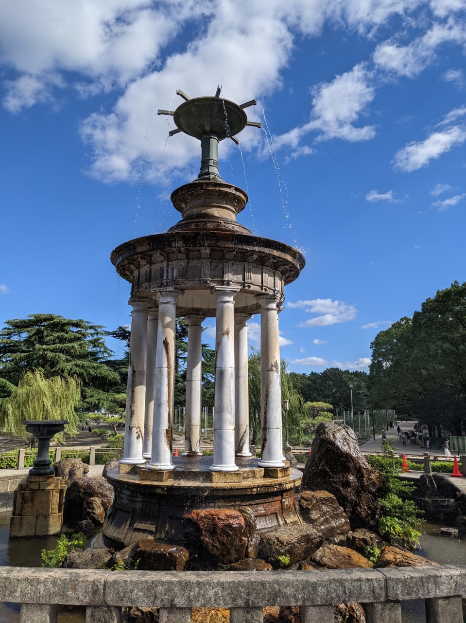 JR鶴舞公園駅から直ぐの鶴舞公園内に噴水塔はありました。明治時代(明治43年)に建てられたローマ様式の大理石の柱を使った噴水塔は、かなりレトロ感がありましたが、鶴舞公園内のシンボル的な存在であり、見ごたえがありました。