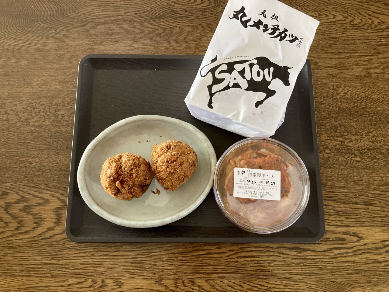 丸メンチカツ5個とキムチを買いました。メンチカツは@250円、5個以上で@230円になっていました。10円の値上がりですね。でも相変わらず美味しいです。