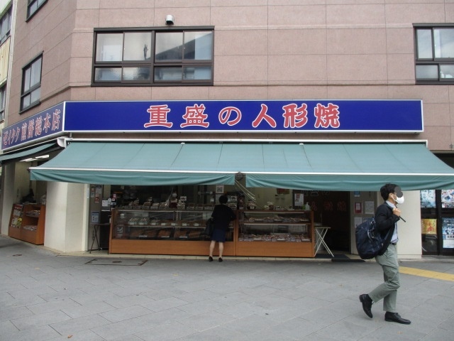 人形町通り水天宮前交差点にある人形焼き老舗重盛永信堂があります。重盛永信堂は大正6年創業で青地の大きな看板は目立ちます。ショーケースに様々な種類の人形焼が並んでます。一個からでも購入可能だそうですので食べ歩きができました。白餡入りは1コ130円とリーズナブルな価格でした。人形焼の餡無しも販売してました。お手頃価格でお土産にお勧めです。甘すぎず美味しく食べやすかったです。