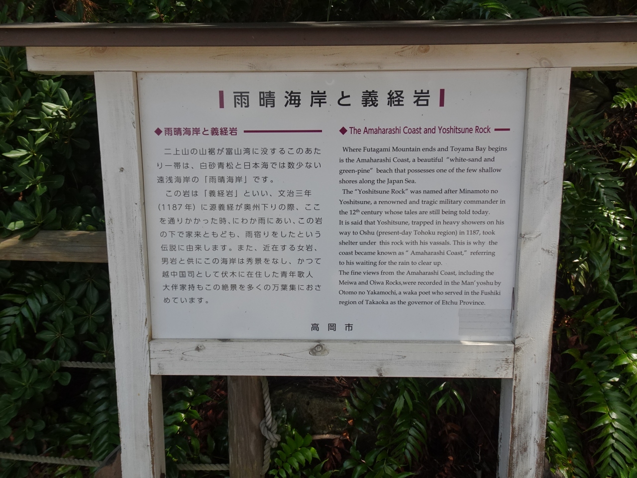奥州に落ち延びる義経が、雨の晴れるのを待っていたという伝説がある「義経岩」。