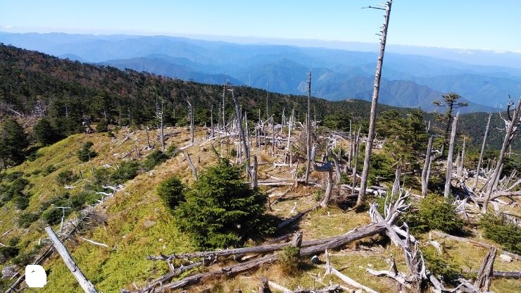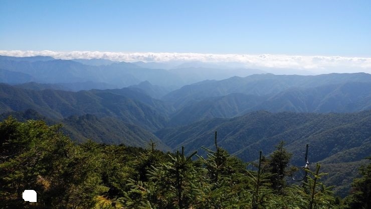 最高峰の八経ヶ岳は隣の山。登り返しがある30分の道のり。樹林帯中心の登山道だが、山頂に着くとようやく360度の眺望が得られるようになった。周辺は山々が広がっており、かなり山深いところにある百名山だった。