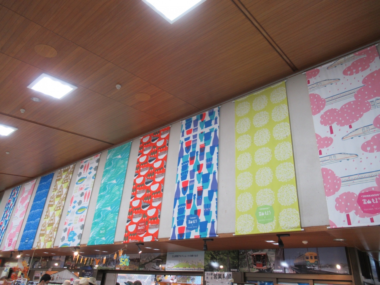電鉄富山駅から立山行の電車は1時間に1本ぐらいで、1時間少しかかります。電車は混んでなかったのですが、ここまでマイカーで来る人も多く、どっと人が増えました。駅内の売店は充実していて、衣類も売っていました。お土産は水まんじゅうが有名です。