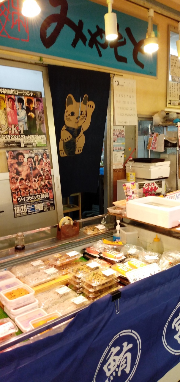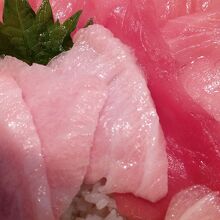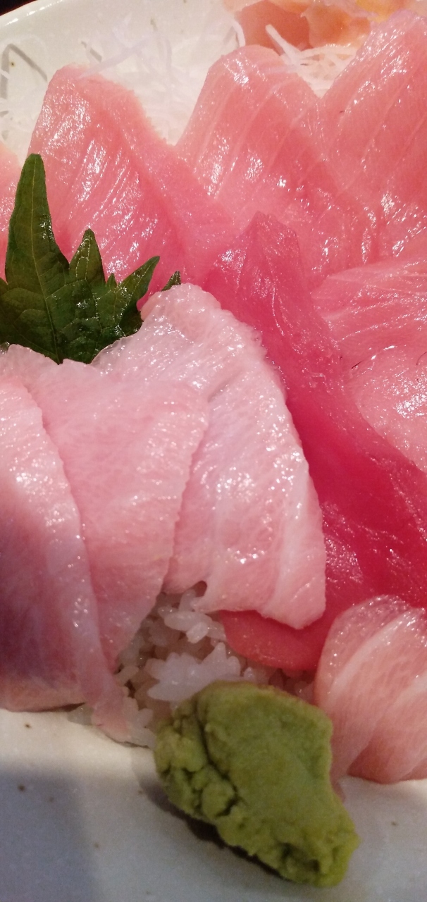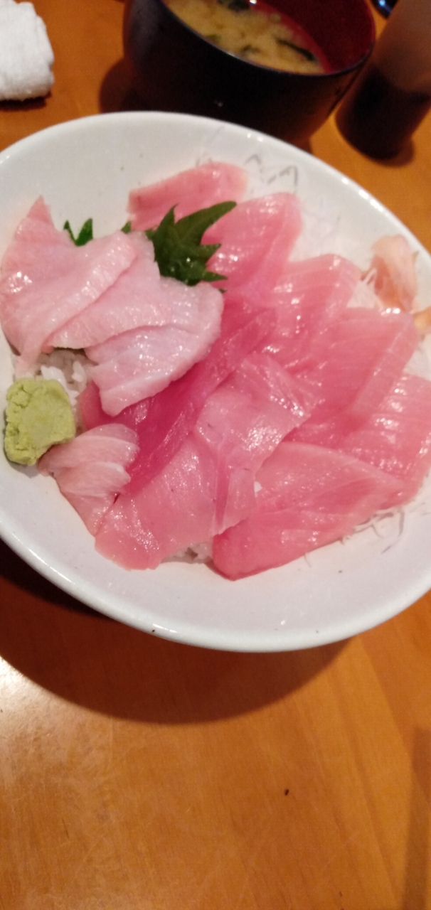 駐車場の南側に行列の宮本商店の河岸の市内のイートイン。場内のニギニギしい感じを受けながら最高のマグロ丼がいただけるお店、っと言い切らせていただきます。冷凍していない生まぐろを扱っているのは此方のみ、とお見受けします。生本マグロ丼で堪能できます。この日は長崎産。中とろが過半数で大トロ、赤身を申し訳みたく載せるという明らかにヘンな構成、最高。ご飯が温かすぎずかといって冷えてなく調度好いので脂が旨く照るニクイ采配。おすすめです。