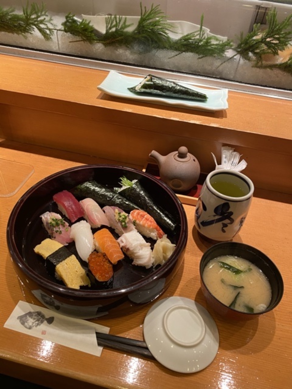 平日のランチで利用しました。食べたのは本日のにぎり1.5人前!にぎり10貫に手巻きが2本です。この日はサービス券があったので更に手巻き1本サービス。お腹いっぱい(^^)